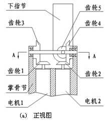 如圖4所示,兩自由度機(jī)構(gòu)結(jié)構(gòu)示意圖。指掌關(guān)節(jié)結(jié)構(gòu)設(shè)計(jì)是研制仿人形靈巧手樣機(jī)的重要一環(huán)。自主研發(fā)的用于指掌關(guān)節(jié)的兩