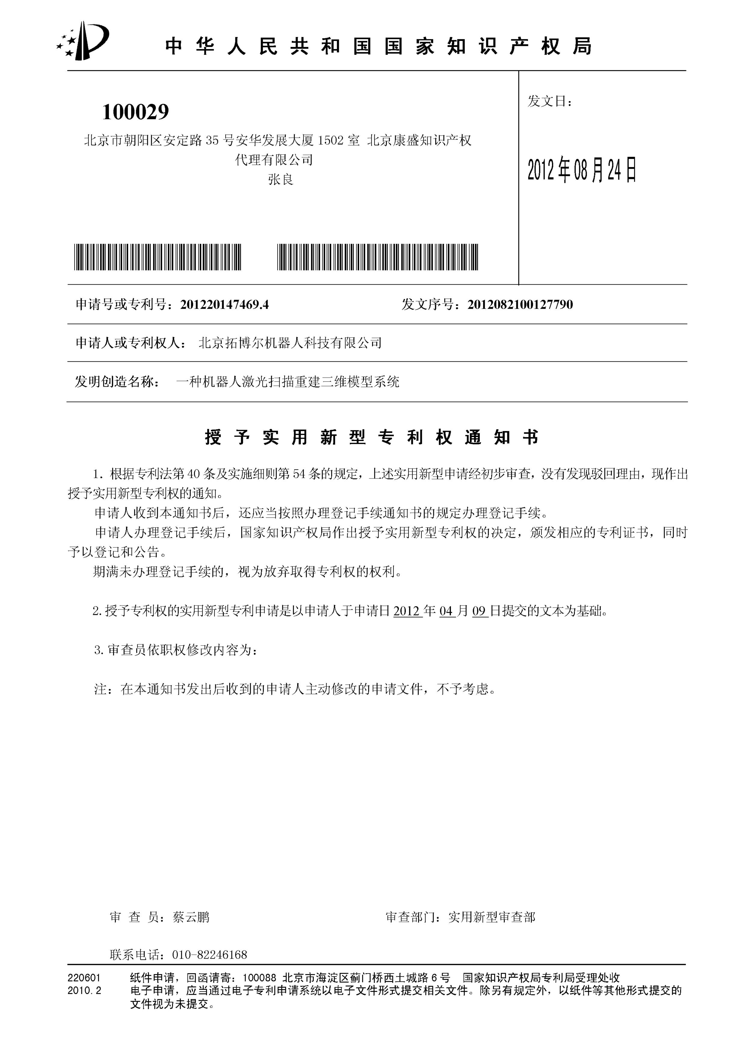 實用新型授權通知書(激光掃描三維模型)